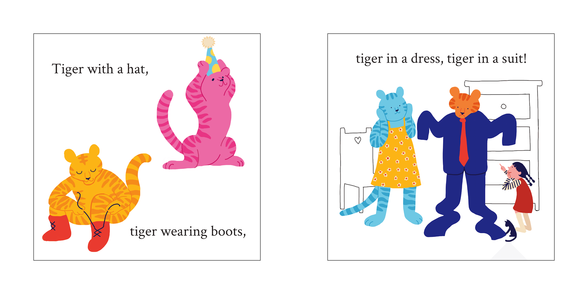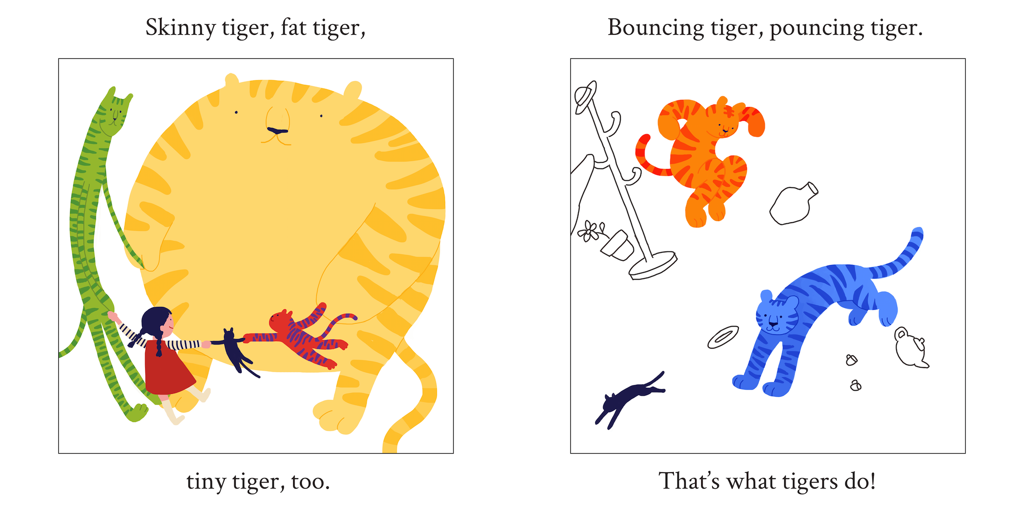 This is a draft of a children's book that I created as the final assignment for Picture and Word at RISD with Judy Sue Goodwin Sturges and April Prince in the fall of 2018. It is about a girl who meets many tigers. Here are some selected spreads!